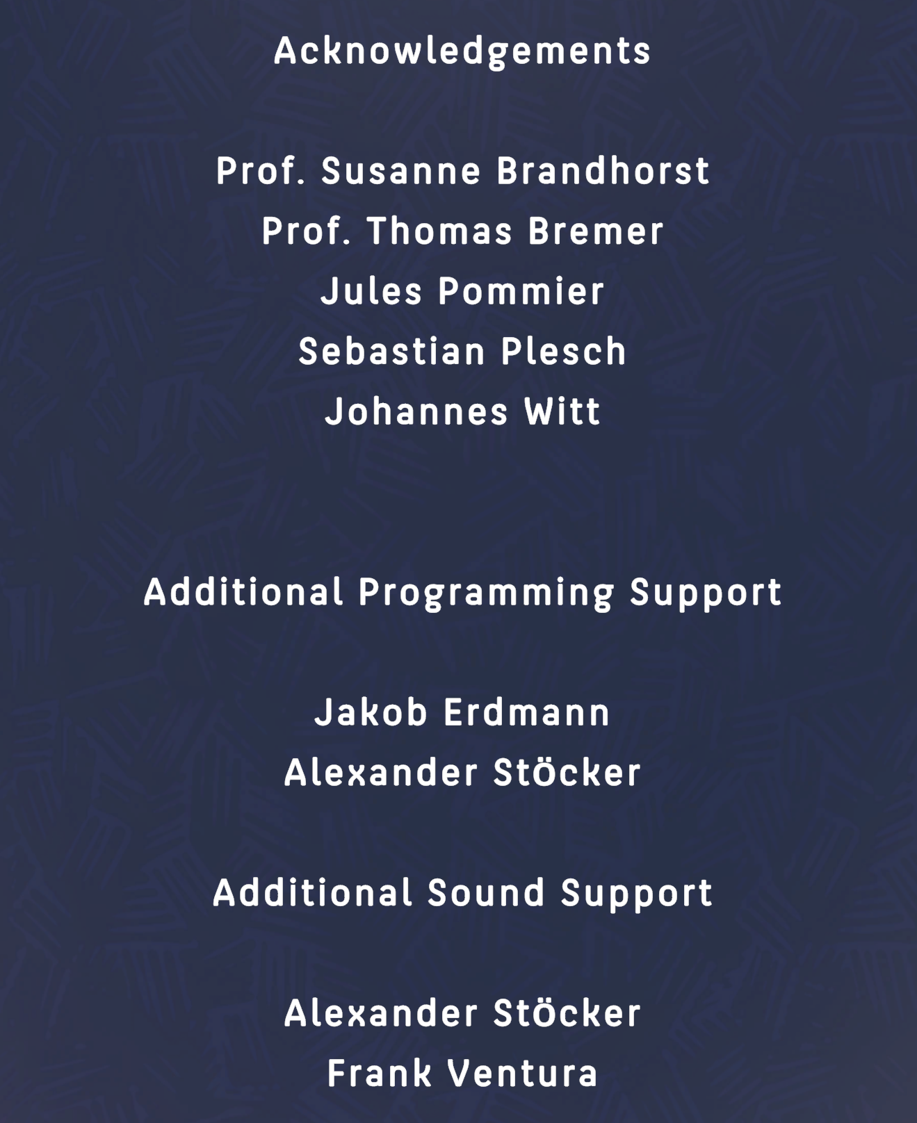 We would like to thank Prof. Susanne Brandhorst, Prof. Thomas Bremer, Jules Pommier, Johannes Witt and Sebastian Plesch for their guidance and support in the development progress.